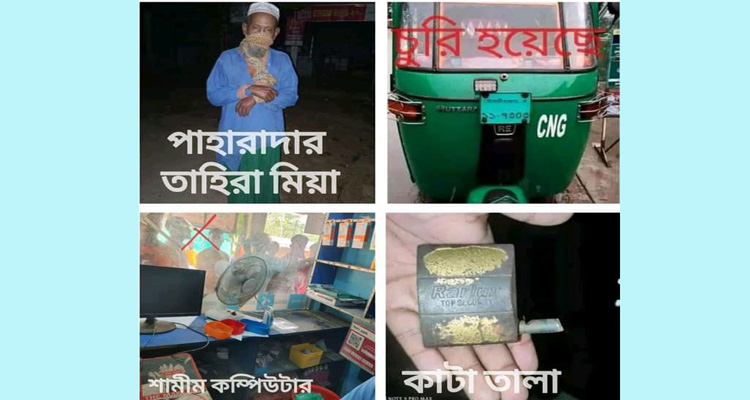 মাহমুদ মিয়ার ভূষি মালের দোকান থেকে প্রায় শত লিটার সোয়াবিন তৈল ও অন্যান্য মালমাল। ব্যবসায়ী মোস্তফা মিয়া বলেন, তার দোকান থেক নগদ প্রায় ৮হাজার টাকা ও জিনিস পত্র নেয়। এছাড়াও আরও সেলুনও কাঠের কারকানা ও তেরাব ভেরাইটিজ ষ্টোর ও সালাম কম্পিউটার এর দোকানে তালা কাটা হয়।মোঃ কালাম মিয়া নামের একজন দরিদ্র সিএনজি চালকের কিস্তিতে কেনা (মৌলভীবাজার-থ ১১৭৩০৩) সিরিয়ালে সিএনজি গাড়ি গ্যারেজ থেকে চুরি হয়।