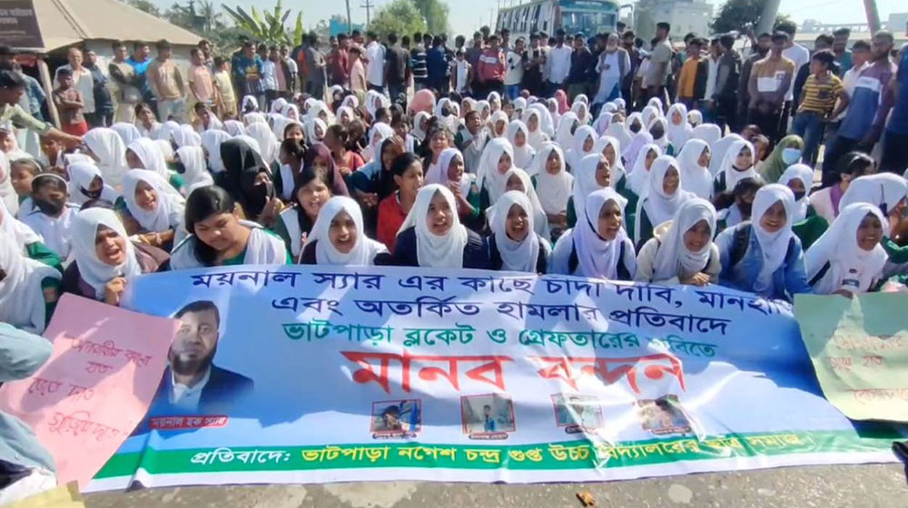 ছাত্রদল নেতার কাছ থেকে বাড়ির নির্মাণসামগ্রী ক্রয় না করায় নরসিংদীর ভাটপাড়ায় এক স্কুলশিক্ষককে মারধর করেছে। এর প্রতিবাদে সড়ক অবরোধ করেছে শিক্ষার্থীরা। ফলে সড়কের উভয় পাশে যান চলাচল বন্ধ হয়ে যায়। এতে প্রায় ১০ কিলোমিটার যানজটের সৃষ্টি হয়। দুভোর্গে পড়েন সাধারণ যাত্রীরা।