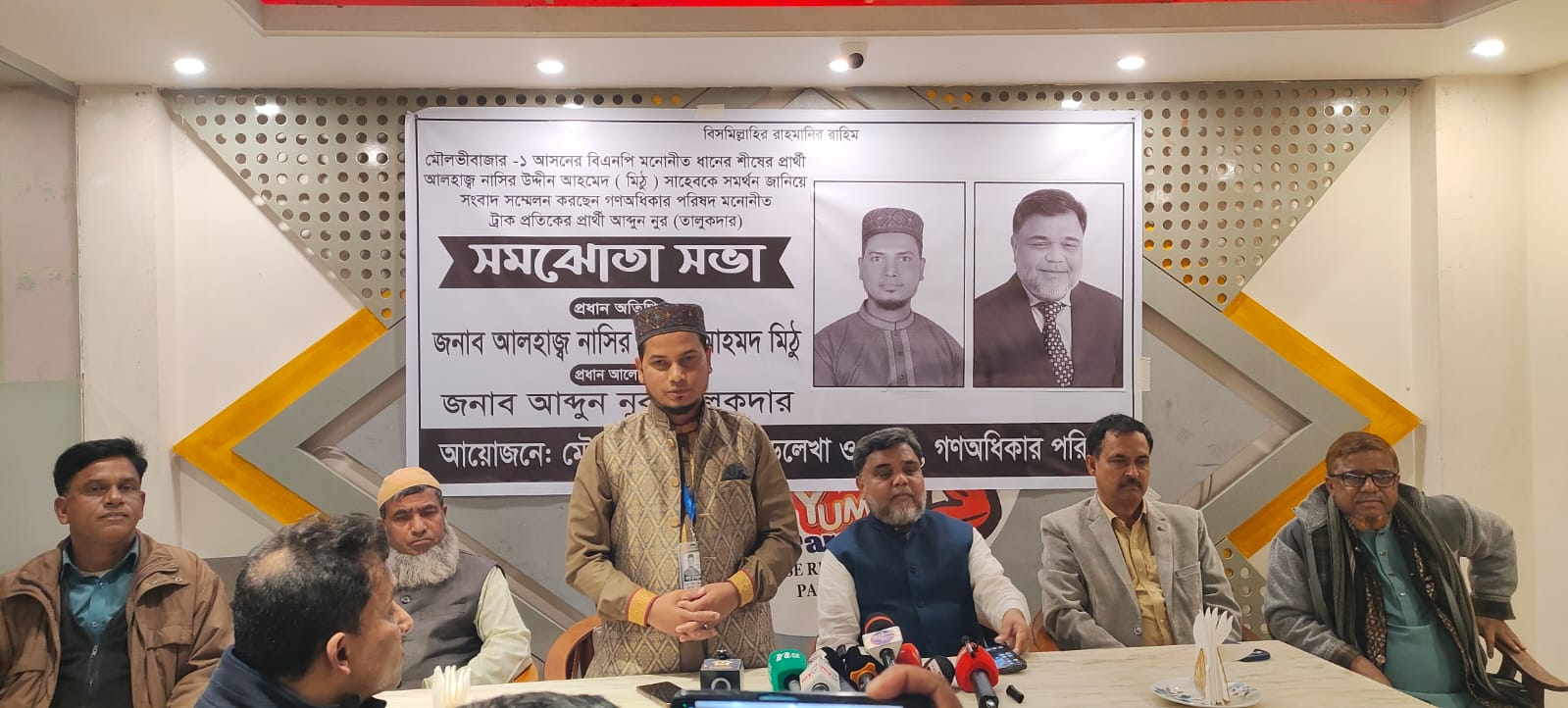মৌলভীবাজার–১ (বড়লেখা–জুড়ী) আসনে নির্বাচনের শেষ দিকে নতুন সমীকরণ তৈরি হয়েছে। গণঅধিকার পরিষদ মনোনীত সংসদ সদস্যপ্রার্থী আব্দুন নূর তালুকদার বিএনপি প্রার্থী নাসির উদ্দিন আহমেদকে পূর্ণ সমর্থন জানিয়েছেন এবং ধানের শীষ প্রতীককে বিজয়ী করার অঙ্গীকার করেছেন।
