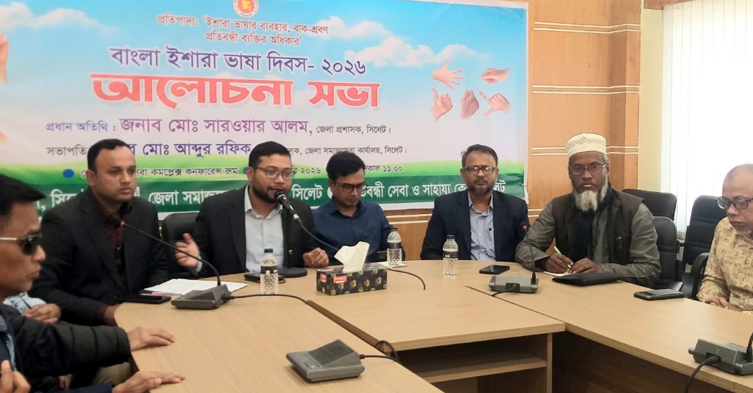 ‘ইশারা ভাষার ব্যবহার, বাক-শ্রবণ প্রতিবন্ধীদের অধিকার’ প্রতিপাদ্যে সারা দেশের মতো সিলেটেও যথাযোগ্য মর্যাদায় বাংলা ইশারা ভাষা দিবস পালিত হয়েছে। এ উপলক্ষে জেলা প্রশাসন, জেলা সমাজসেবা কার্যালয়, প্রতিবন্ধী সেবা ও সাহায্য কেন্দ্র সিলেট এবং বিভিন্ন প্রতিবন্ধী সংগঠনের যৌথ উদ্যোগে শনিবার (৭ ফেব্রুয়ারি) সকাল ১১টায় শেখঘাটস্থ জেলা সমাজসেবা কমপ্লেক্স মিলনায়তনে আলোচনা সভা অনুষ্ঠিত হয়।