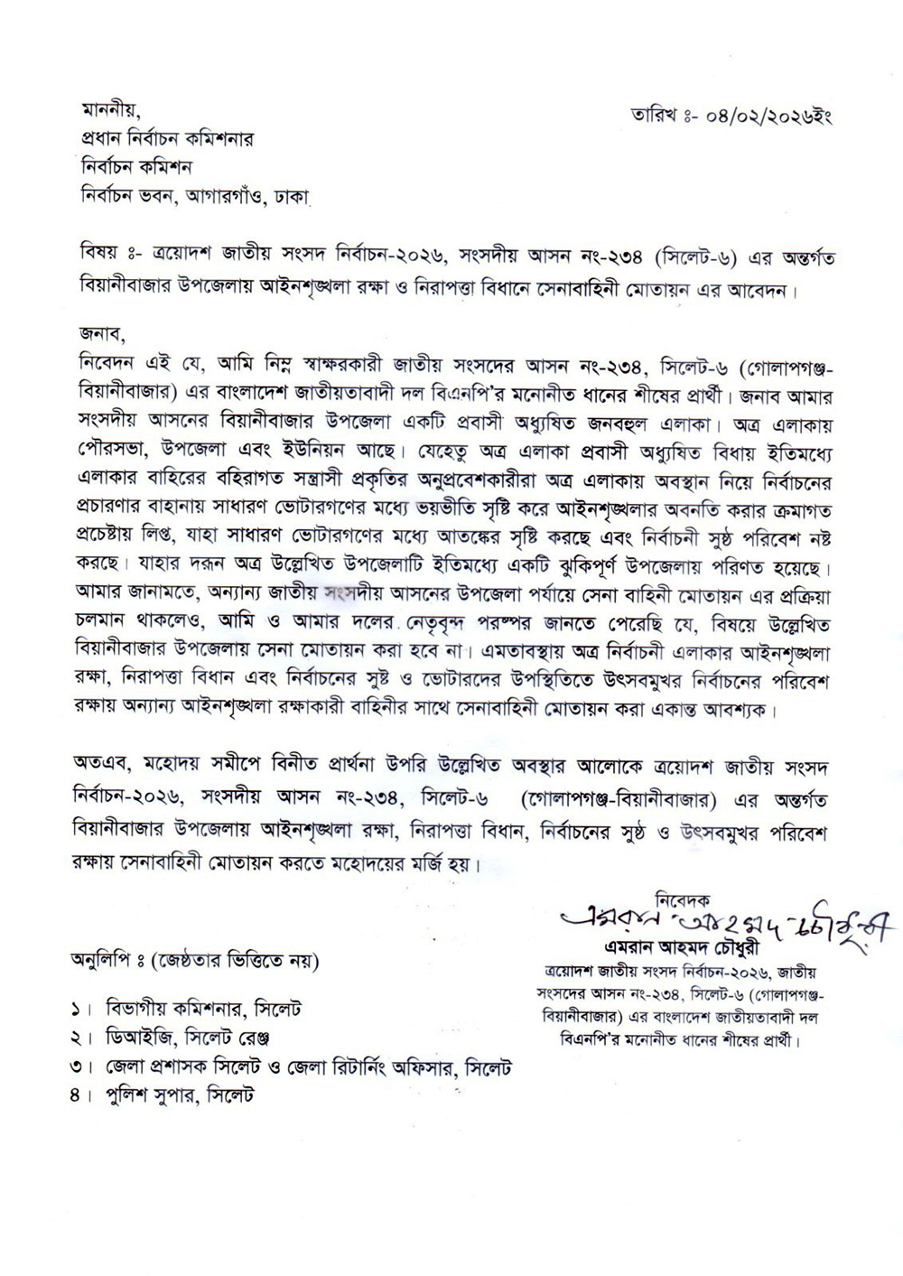 সিলেট-৬ (বিয়ানীবাজার) আসনে সেনাবাহিনী মোতায়েনের দাবি জানিয়ে নির্বাচন কমিশন (ইসি) ও নির্বাচনী অনুসন্ধান ও বিচারিক কমিটির কাছে আবেদন করেছেন বিএনপি মনোনীত সংসদ সদস্য প্রার্থী ও জেলা বিএনপির সাধারণ সম্পাদক অ্যাডভোকেট এমরান আহমদ চৌধুরী। গত ৪ ও ৫ ফেব্রুয়ারি পৃথক দুটি আবেদন জমা দেন তিনি।