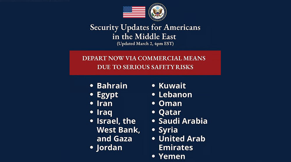 চলমান সংঘাতের প্রেক্ষাপটে মধ্যপ্রাচ্যের কয়েক দেশ এখনই ছাড়তে মার্কিন নাগরিকদের তাগিদ দিয়েছে যুক্তরাষ্ট্রের পররাষ্ট্র দপ্তর। মঙ্গলবার ( ৩ মার্চ) যুক্তরাষ্ট্রের পররাষ্ট্র দপ্তরের ভেরিফায়েড ফেসবুক ও এক্সে দেওয়া পোস্টে এই তাগিদ দেওয়া হয়।
